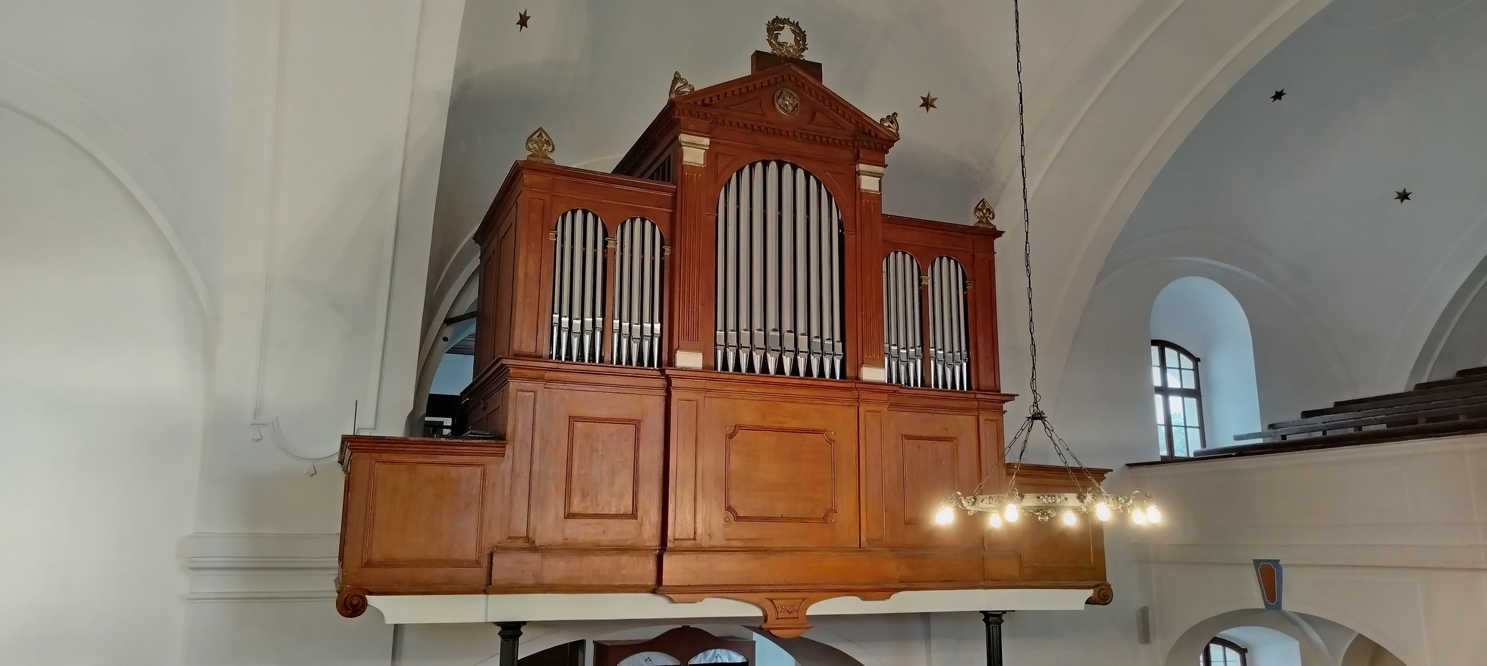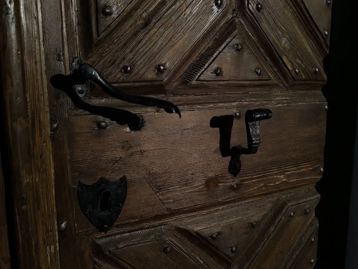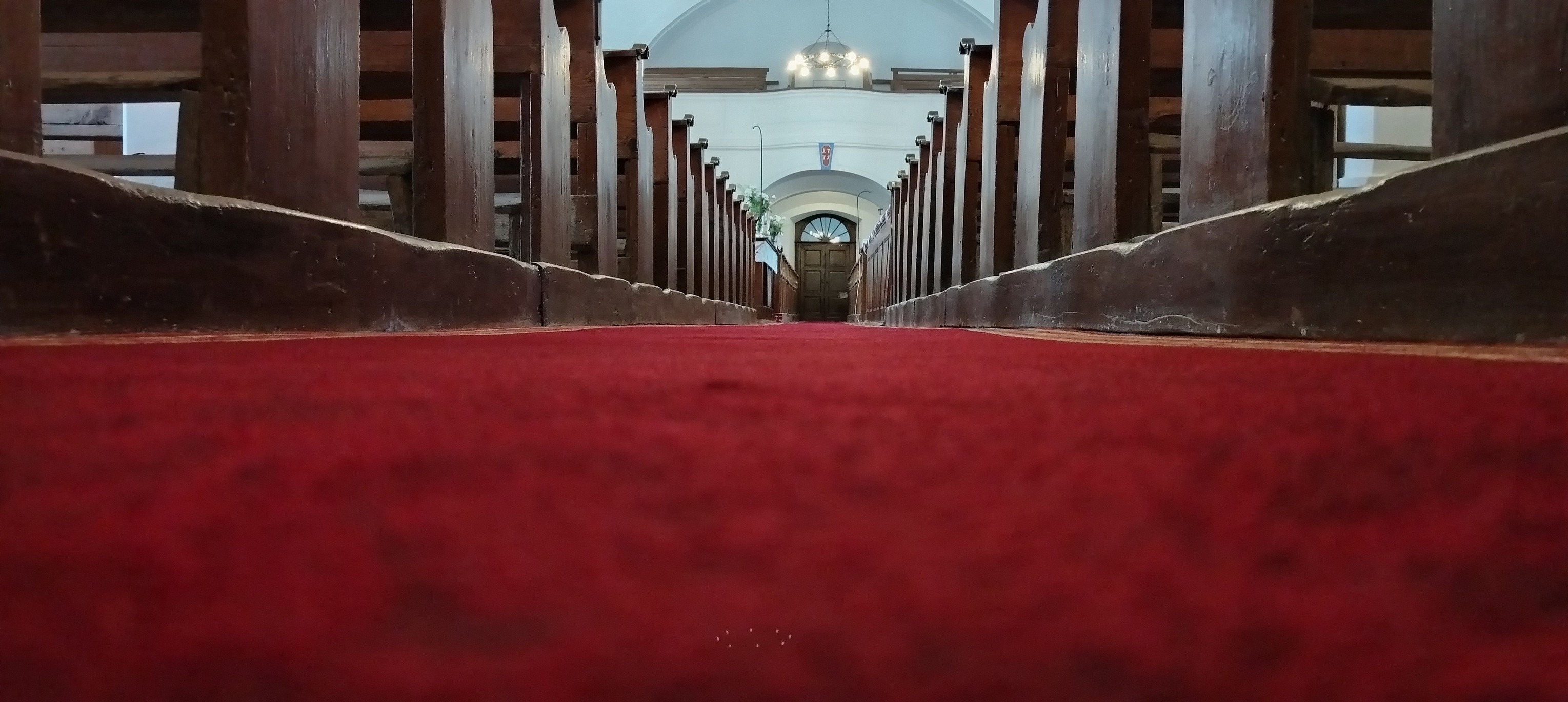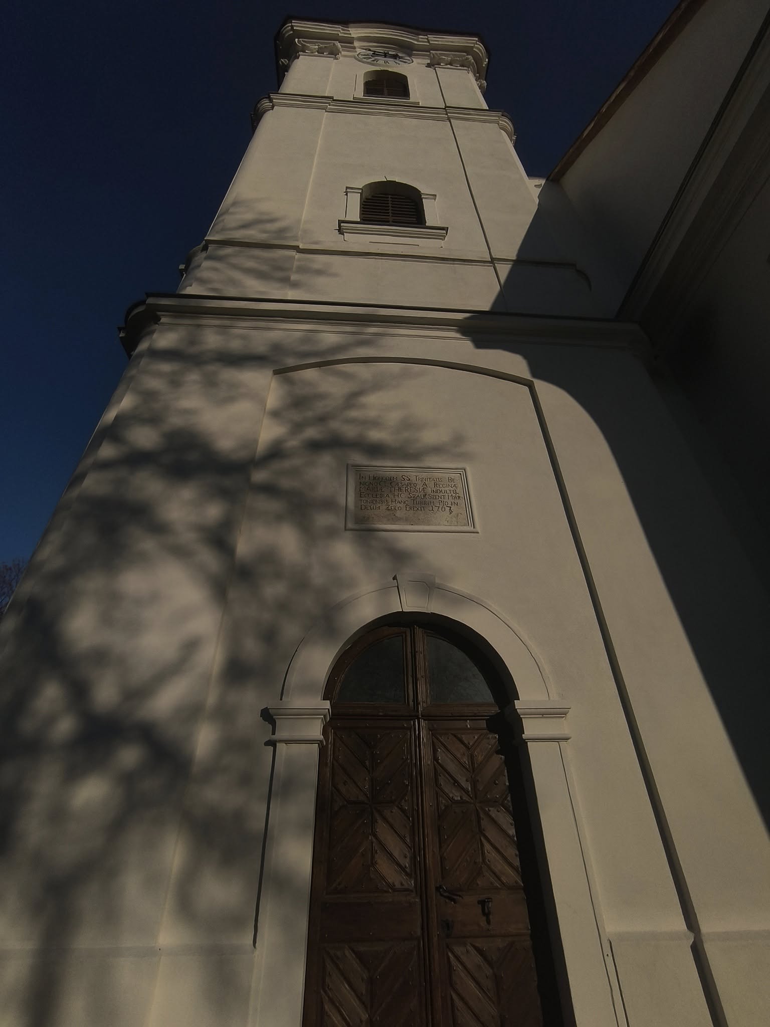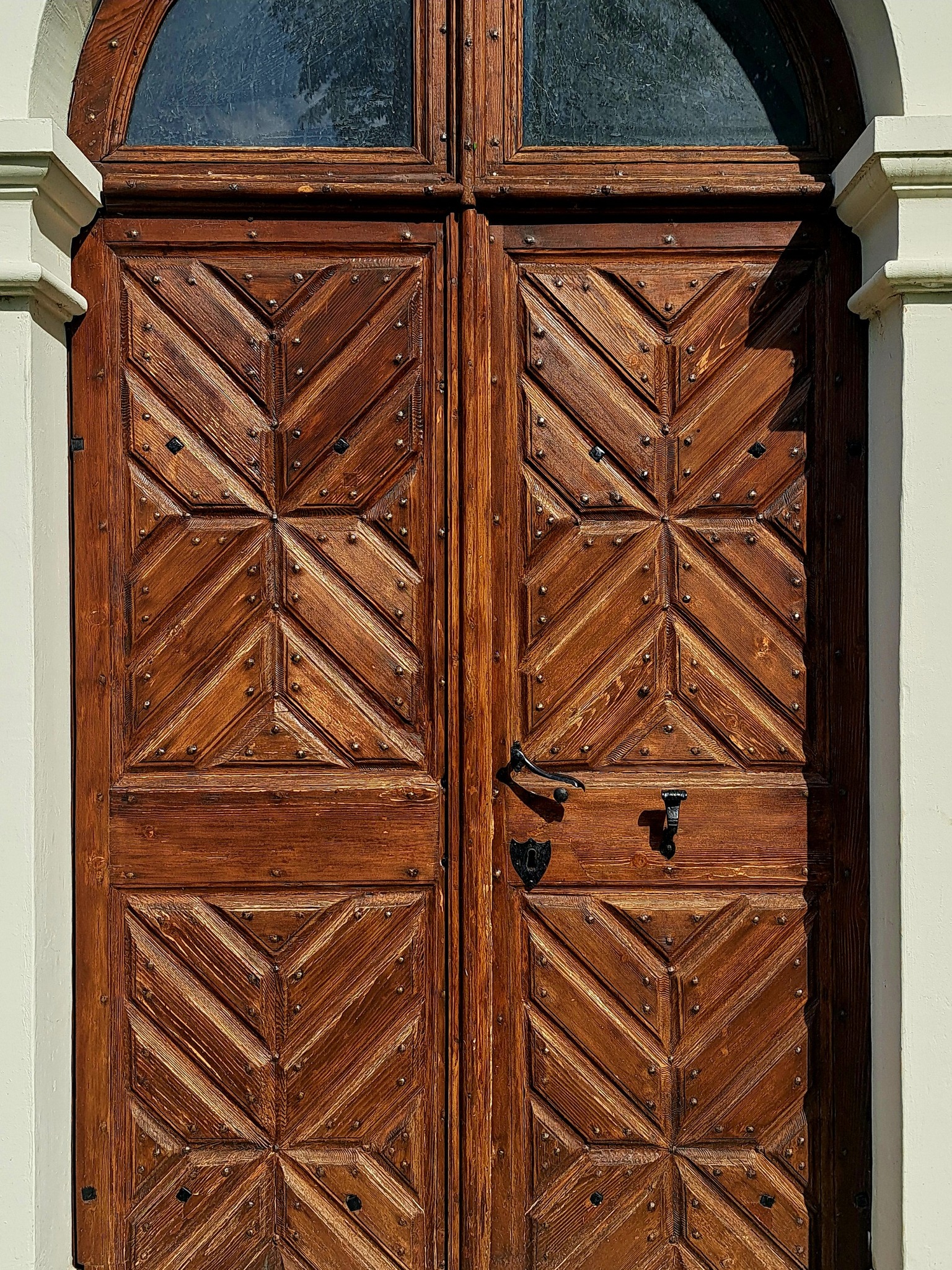 A kapu maga félköríves záródású, kőkeretes nyílásban ül, és egy sötétbarna, kazettás (táblás) faajtó tölti ki. A kapu arányai nyugodtak és méltóságteljesek: egyszerre praktikus bejárat és egyfajta „átmenet” a kinti tér és a templombelső csendje között. Az egész részlet hatását a fehér fal–barna tető–sötét ajtó hármasa teszi különösen fotogénné, főleg ilyen enyhén alulnézeti perspektívából.