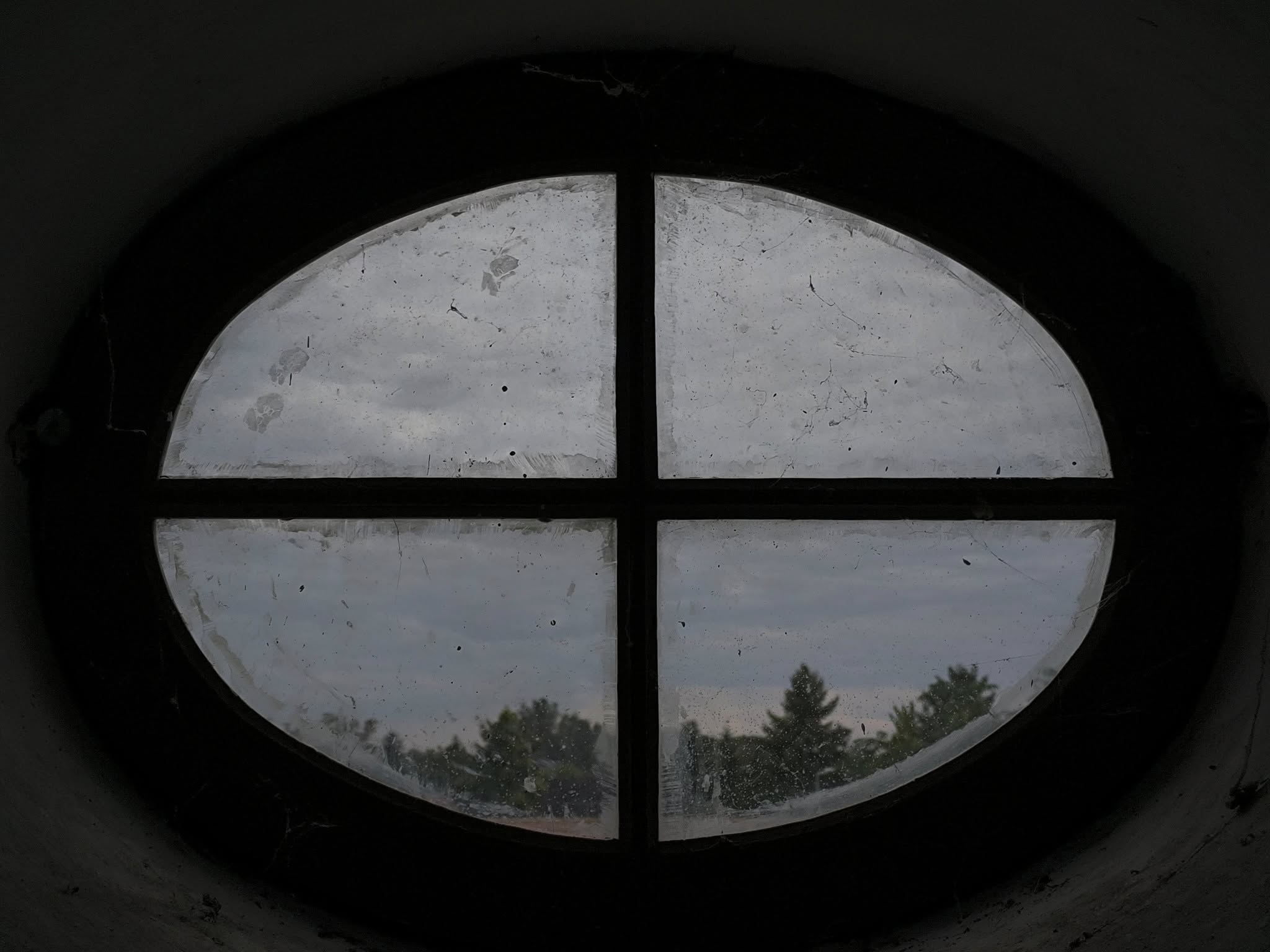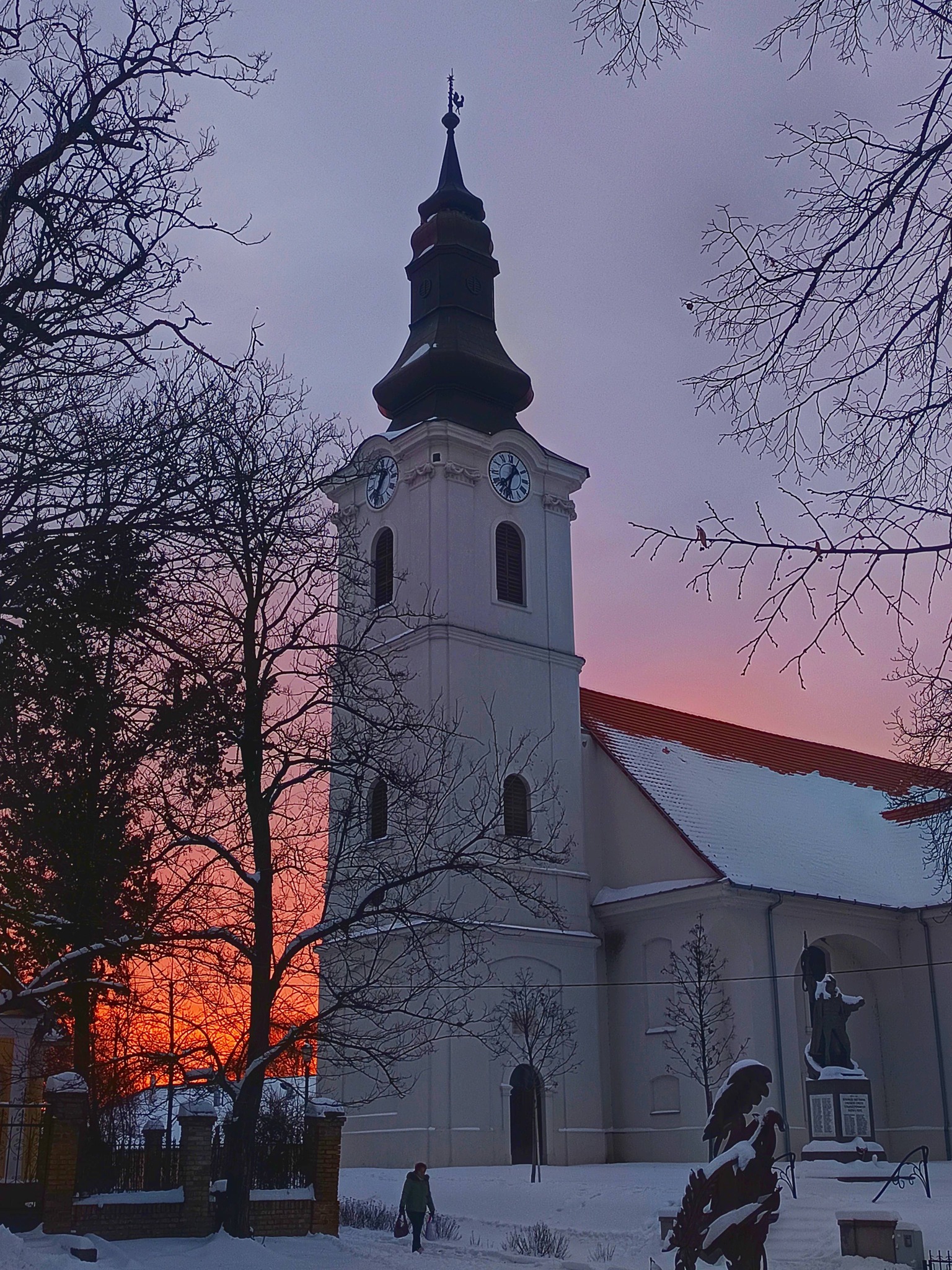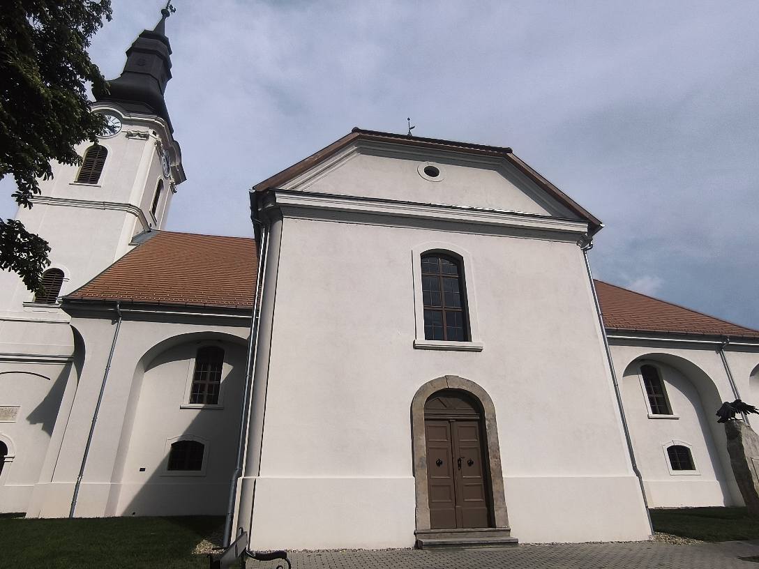 Farkas András “Összkép” című fotóján a templom egy letisztult, fehérre vakolt oldalfelülete látszik, amelyet a háromszögű oromfal és az erős vízszintes párkányvonalak tagolnak. Az oromzat alatt egy magas, keskeny, íves záródású ablak nyújtja meg a homlokzati mezőt, feljebb pedig egy kisméretű kerek nyílás (okulusz) ad finom hangsúlyt a kompozíciónak. Balra részben feltűnik a torony is, ami a tömegnek karaktert és „irányt” ad.